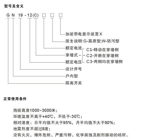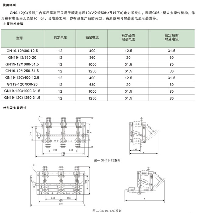 GN19-12型系列戶內高壓隔離開關系高壓開關設備,用于額定電壓12千伏,交流50Hz及以下電力系統中,配用CS6-1型操作機構,作為在有電壓而無負載的情況下,分、合電路之用。