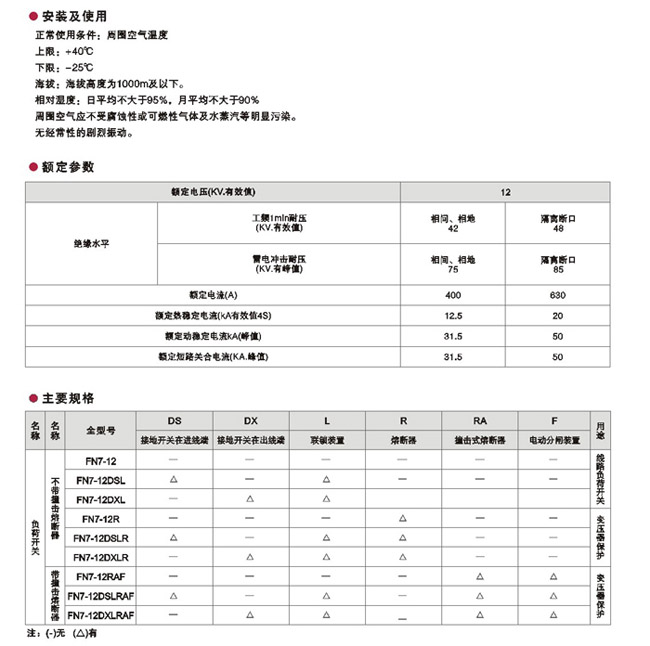 FN7-12DR型交流高壓負荷開關是一種新型產氣式戶內高壓負荷開關,適用于交流50Hz,額定電壓12kV的三相交流電力系統中,作為開斷負荷電流及關合短路電流之用。